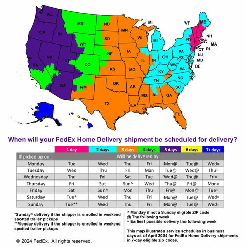 See map below for estimated shipping times from our warehouse in West Bridgewater, Massachusetts when shipped via FedEx.